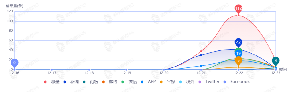 截至目前,该文章在互联网上传播总量共168篇。其中,12月22日是传播的高峰期,共传播112篇文章。各信源的信息发布情况中,新闻信息占比最大,其次是APP和微博,占比分别为39.33%、20.67%、18.67%。(数据来源:新华睿思·数媒智慧分析平台)