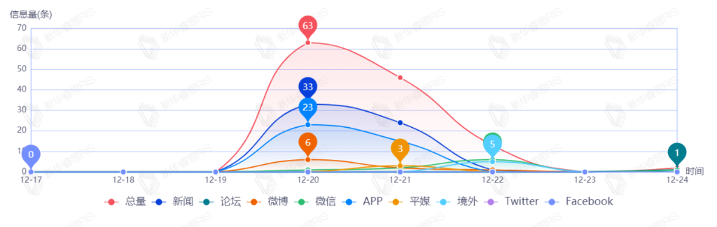 截至目前,该文章在互联网上传播总量共122篇。其中,12月20日是传播的高峰期,共传播63篇文章。各信源的信息发布情况中,新闻信息占比最大,其次是APP和微信,占比分别为43.36%、33.63%、7.96%。(数据来源:新华睿思·数媒智慧分析平台)