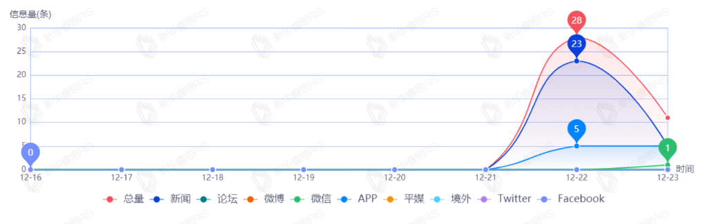 截至目前,该文章在互联网上传播总量共39篇。其中,12月22日是传播的高峰期,共传播28篇文章。各信源的信息发布情况中,新闻信息占比最大,其次是APP和微信,占比分别为68.57%、28.57%、2.86%。(数据来源:新华睿思·数媒智慧分析平台)