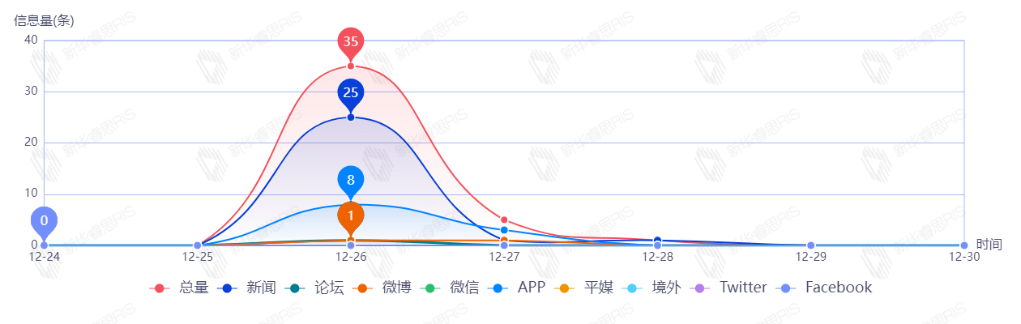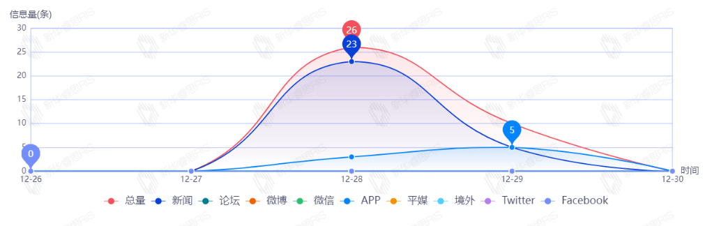 截至目前,该文章在互联网上传播总量36篇。其中12月28日是传播的高峰期,共传播26篇文章。各信源的信息发布情况中,新闻信息和APP占比最大,占比分别为73.33%和26.67%。(数据来源:新华睿思数据云图分析平台)