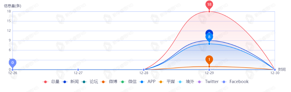 截至目前,该文章在互联网上传播总量18篇。其中12月28日是传播的高峰期,共传播18篇文章。各信源的信息发布情况中,新闻信息和APP占比最大,占比分别为47.06%和47.06%。(数据来源:新华睿思数据云图分析平台)