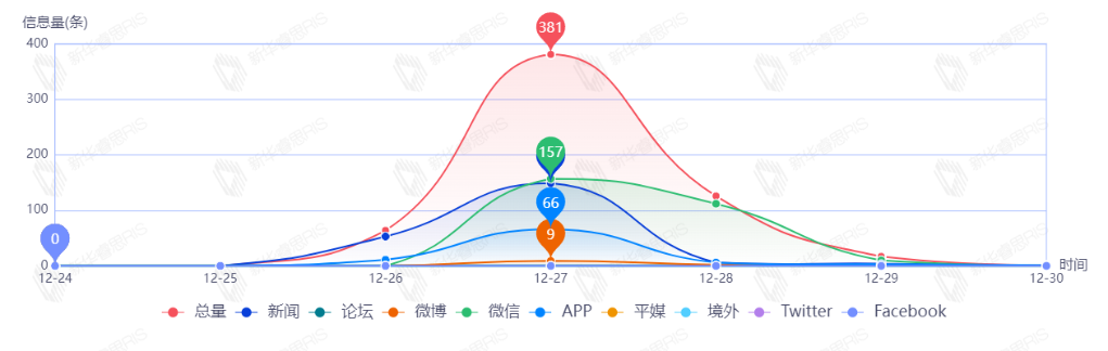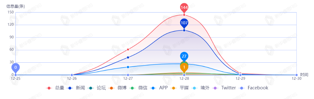 截至目前,该文章在互联网上传播总量209篇。其中12月28日是传播的高峰期,共传播144篇文章。各信源的信息发布情况中,新闻信息和APP占比最大,占比分别为65.88%和27.65%。(数据来源:新华睿思数据云图分析平台)