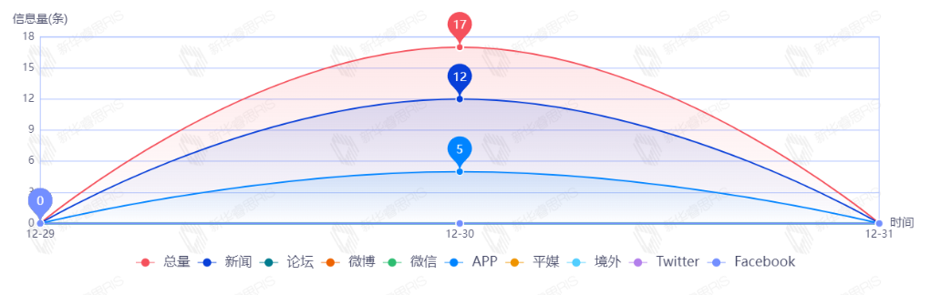 截至目前,该文章在互联网上传播总量17篇。其中12月30日是传播的高峰期,共传播17篇文章。各信源的信息发布情况中,新闻信息和APP占比分别为64.29%和35.71%。(数据来源:新华睿思数据云图分析平台)