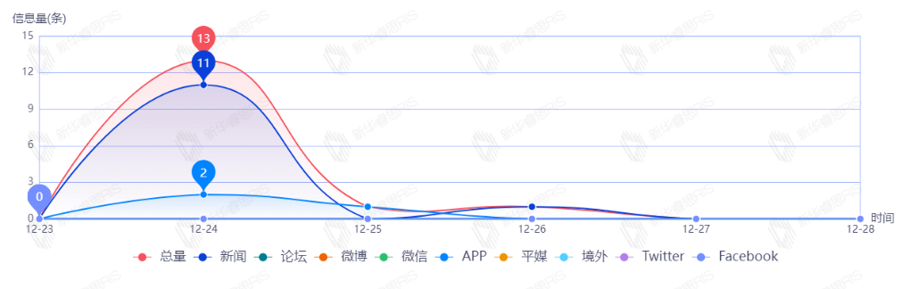 截至目前,该文章在互联网上传播总量15篇。其中12月24日是传播的高峰期,共传播13篇文章。各信源的信息发布情况中,新闻信息和APP占比分别为72.73%和27.27%。(数据来源:新华睿思数据云图分析平台)