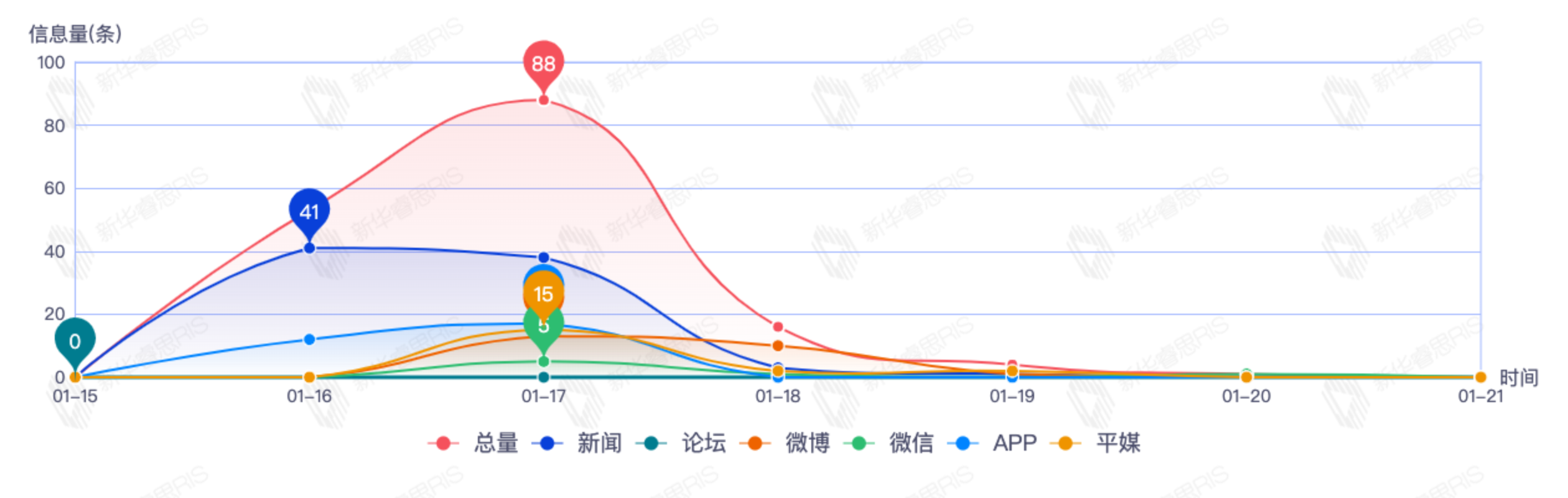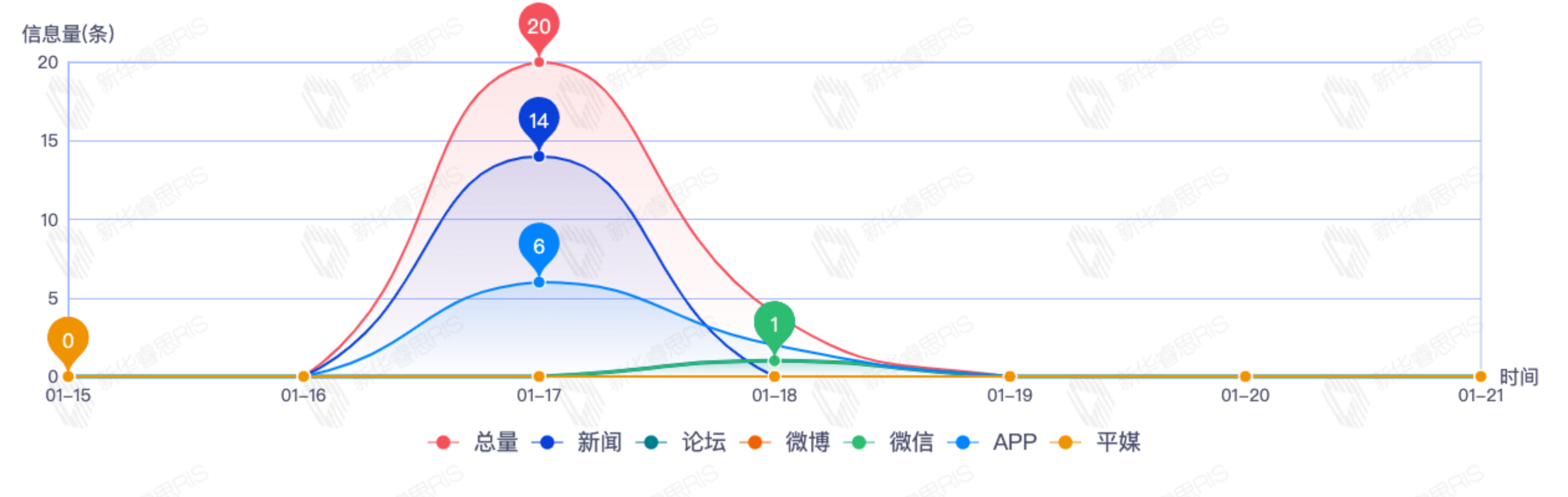 截至目前,该文章在互联网上传播总量共24篇。其中,1月17日是传播的高峰期,共传播20篇文章。各信源的信息发布情况中,其中新闻信息占比最大,其次是APP和论坛,信息量分别为9、8、1,占比分别为47.37%、42.11%、5.26%。(数据来源:新华睿思·数媒智慧分析平台)