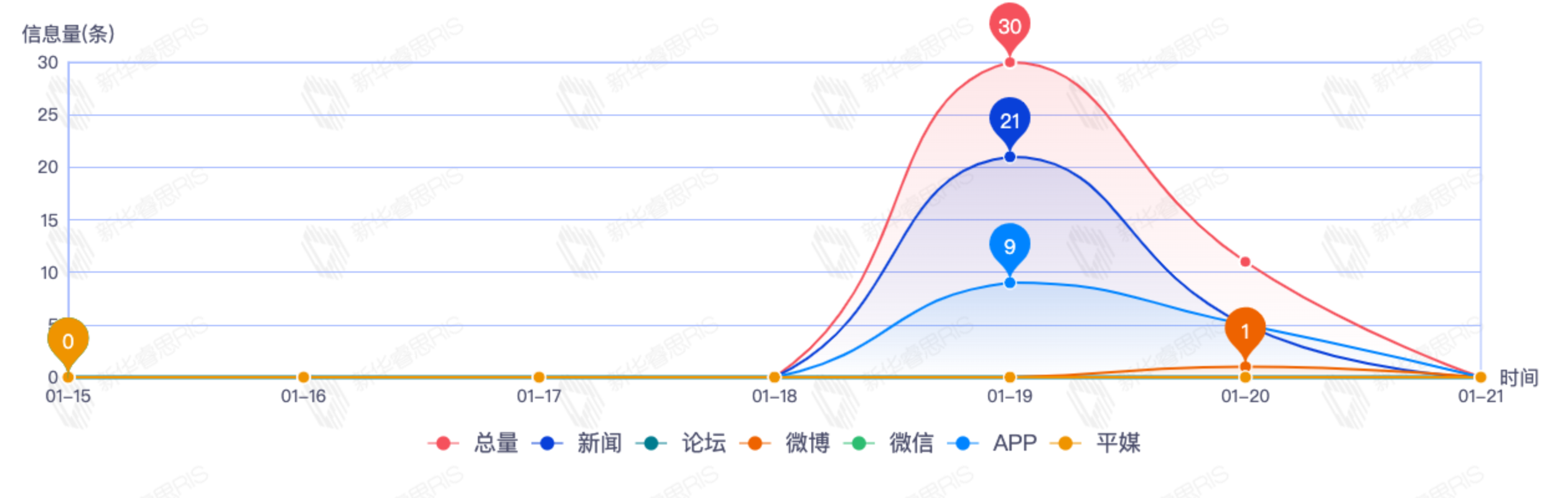 截至目前,该文章在互联网上传播总量共41篇。其中,1月19日是传播的高峰期,共传播30篇文章。各信源的信息发布情况中,其中新闻信息占比最大,其次是APP和微博,信息量分别为17、14、1,占比分别为53.13%、43.75%、3.13%。(数据来源:新华睿思·数媒智慧分析平台)
