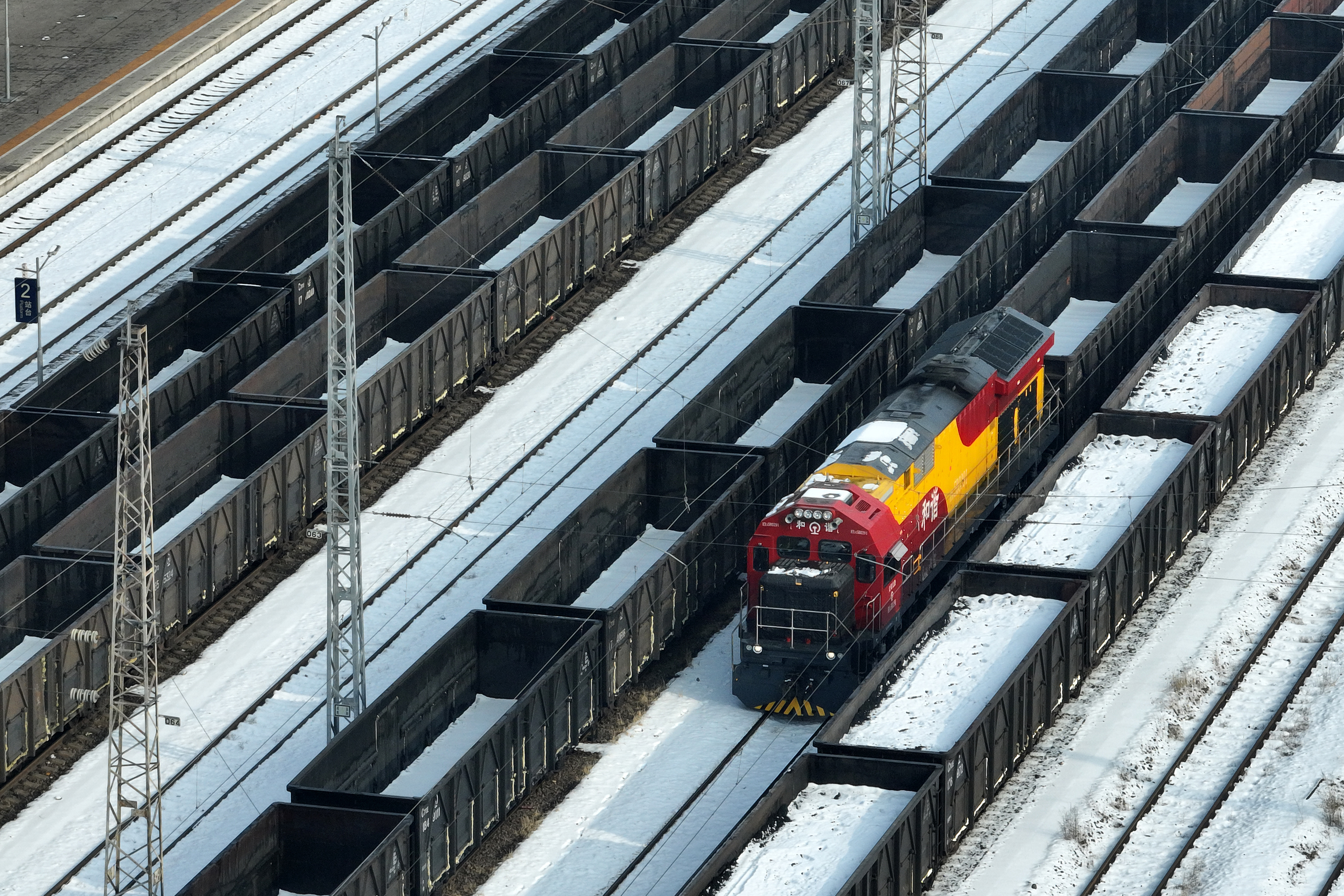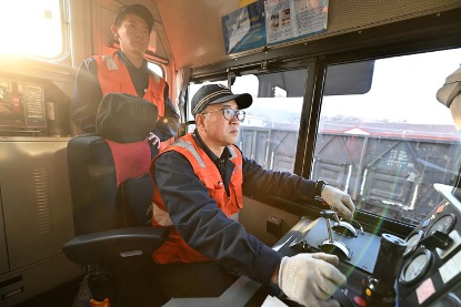 一场降雪过后,吕梁山银装素裹,中国铁路太原局集团有限公司轩岗站火车调车司机李志军和徒弟张立新冒着风雪,在调车机前仔细检查。冬季,各地供暖供电用煤需求增加。轩岗站的火车调车司机担负着一趟趟货运列车的解体、编组、取送等作业任务。(新华社记者詹彦)