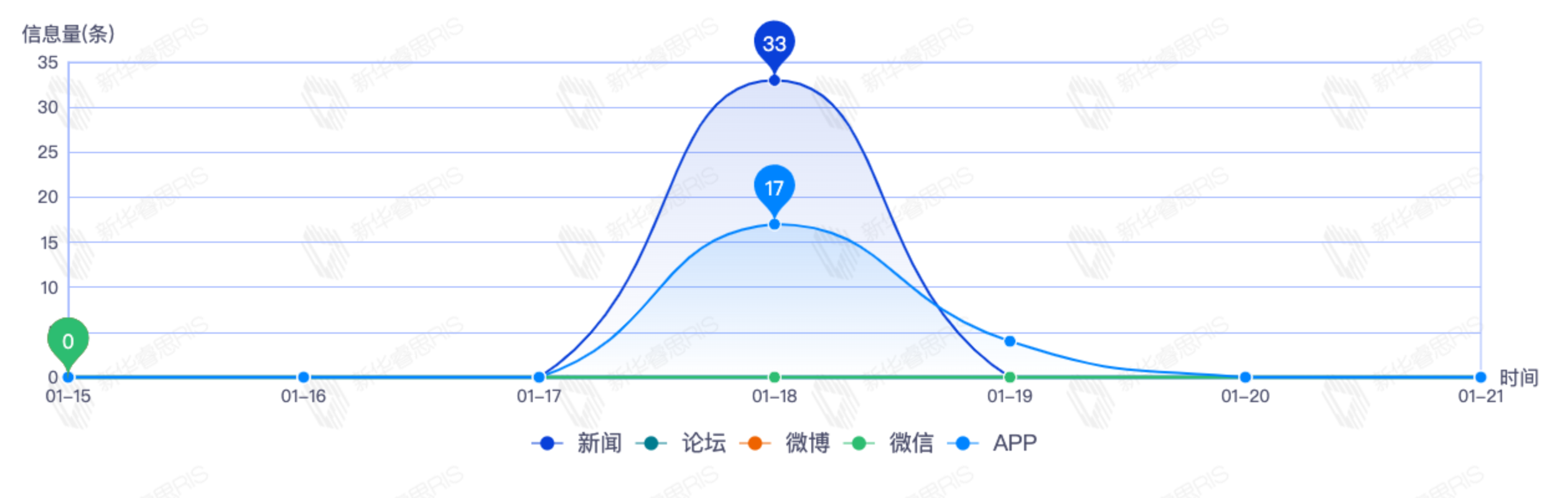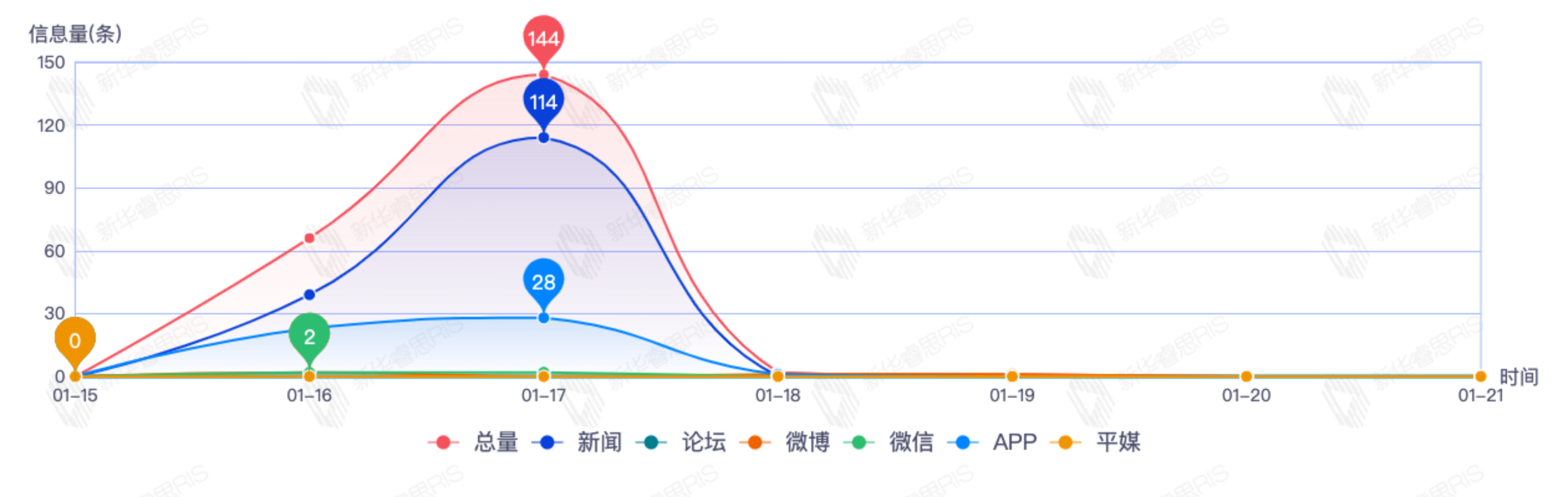截至目前,该文章在互联网上传播总量共213篇。其中,1月17日是传播的高峰期,共传播144篇文章。各信源的信息发布情况中,新闻信息占比最大,其次是APP和微博,信息量分别为116、52、4,占比分别为66.29%、29.71%、2.29%。(数据来源:新华睿思·数媒智慧分析平台)