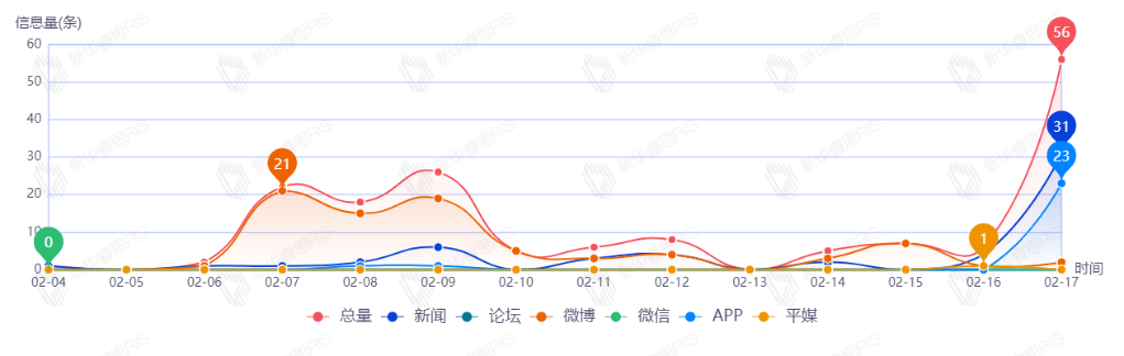 截至目前,该文章在互联网上传播总量162篇。其中2月17日是传播的高峰期,共传播56篇文章。各信源的信息发布情况中,其中微博信息占比最大,其次是新闻和APP,占比分别为50.00%、33.95%、15.43%。(数据来源:新华睿思数据云图分析平台)