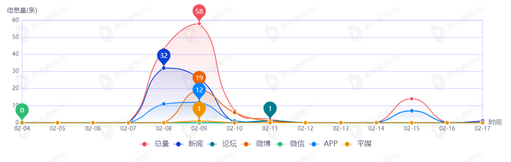 截至目前,该文章在互联网上传播总量125篇。其中2月9日是传播的高峰期,共传播58篇文章。各信源的信息发布情况中,新闻信息占比最大,其次是APP和微博,占比分别为52.80%、24.80%、20.80%。(数据来源:新华睿思数据云图分析平台)