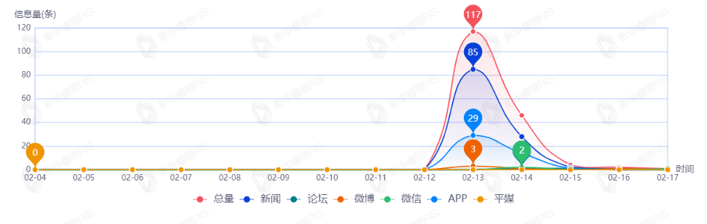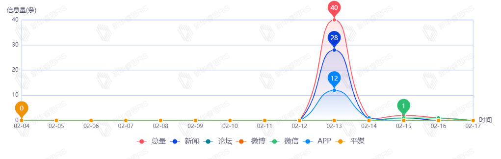 截至目前,该文章在互联网上传播总量44篇。其中2月13日是传播的高峰期,共传播40篇文章。各信源的信息发布情况中,其中新闻信息占比最大,其次是APP和微信,占比分别为65.91%、29.55%、4.55%。(数据来源:新华睿思数据云图分析平台)