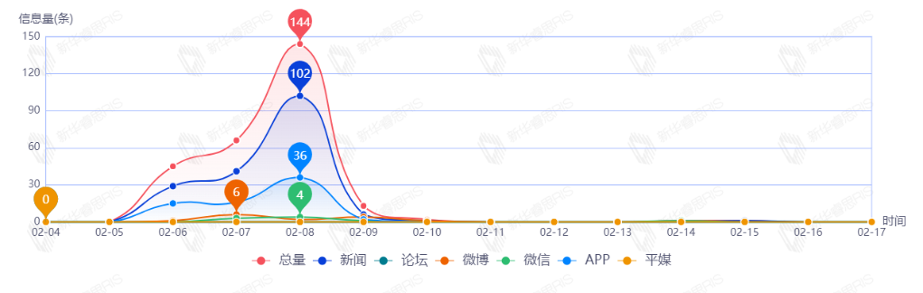 截至目前,该文章在互联网上传播总量272篇。其中2月8日是传播的高峰期,共传播144篇文章。各信源的信息发布情况中,新闻信息占比最大,其次是APP和微博,占比分别为66.18%、25.37%、5.15%。(数据来源:新华睿思数据云图分析平台)
