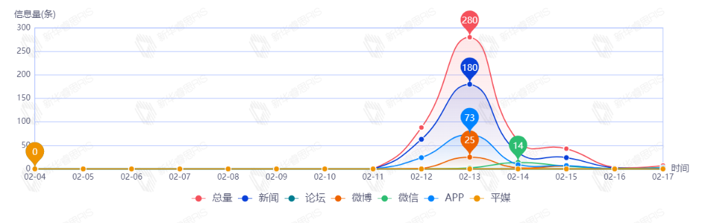 截至目前,该文章在互联网上传播总量481篇。其中2月13日是传播的高峰期,共传播280篇文章。各信源的信息发布情况中,新闻信息占比最大,其次是APP和微博,占比分别为63.41%、23.91%、7.28%。(数据来源:新华睿思数据云图分析平台)