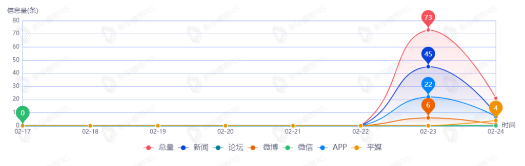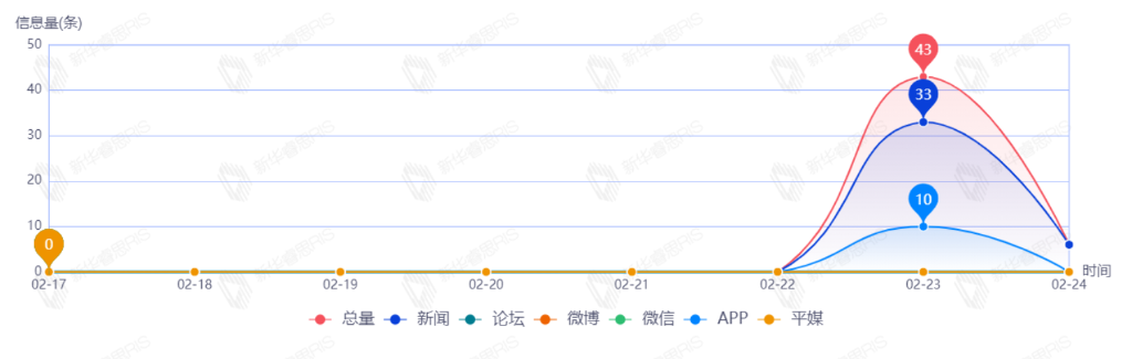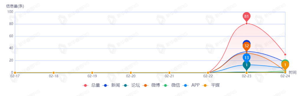 截至目前,该文章在互联网上传播总量共111篇。其中,2月23日是传播的高峰期,共传播81篇文章。各信源的信息发布情况中,新闻信息占比最大,其次是微博和APP,占比分别为44.86%、31.78%、18.69%。(数据来源:新华睿思·数媒智慧分析平台)