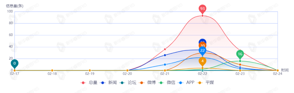 截至目前,该文章在互联网上传播总量共94篇。其中,2月23日是传播的高峰期,共传播73篇文章。各信源的信息发布情况中,新闻信息占比最大,其次是APP和微博,占比分别为56.99%、31.18%、7.53%。(数据来源:新华睿思·数媒智慧分析平台)