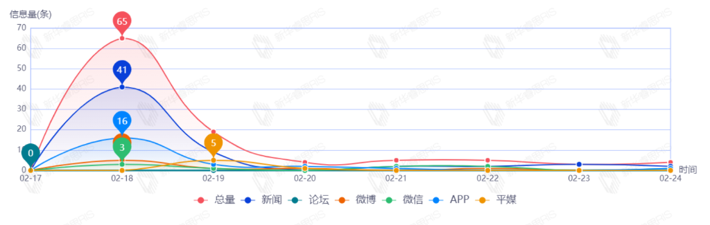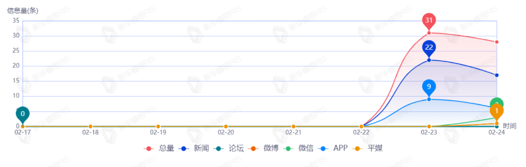 截至目前,该文章在互联网上传播总量共59篇。其中,2月23日是传播的高峰期,共传播31篇文章。各信源的信息发布情况中,新闻信息占比最大,其次是APP和微信,占比分别为66.10%、25.42%、5.08%。(数据来源:新华睿思·数媒智慧分析平台)