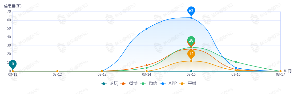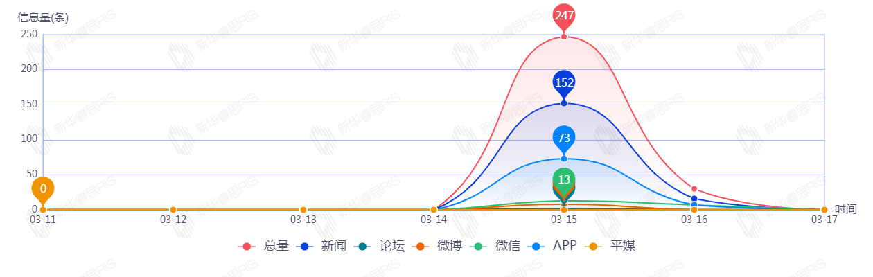 截至目前,该文章在互联网上传播总量共77篇。其中3月15日是传播的高峰期,共传73篇文章。各信源的信息发布情况中,其中新闻信息占比最大,其次是APP和微信,占比分别为59.93%、29.41%、7.35%。(数据来源:新华睿思·数媒智慧分析平台)