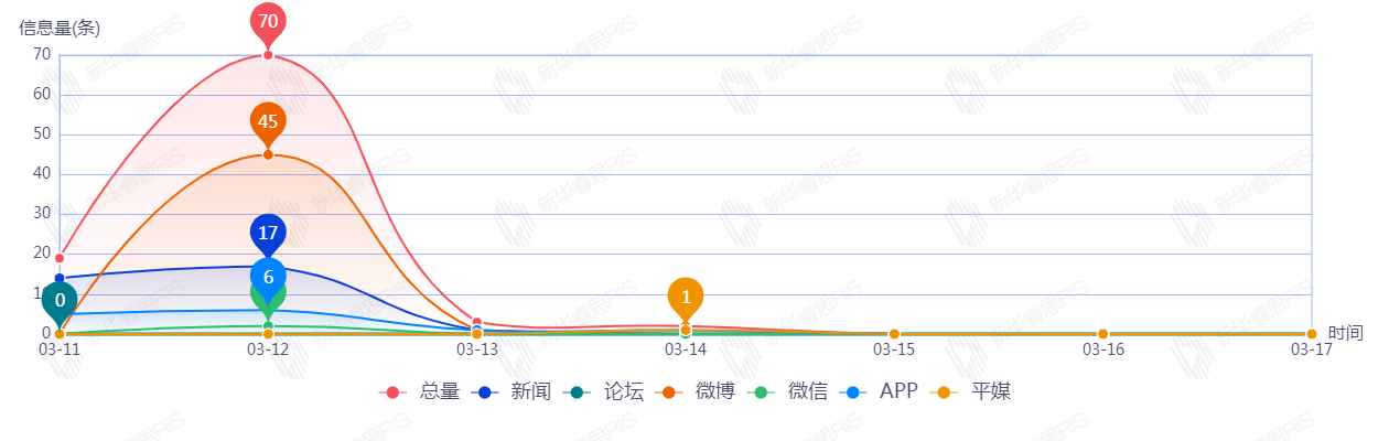 截至目前,该文章在互联网上传播总量共94篇。其中,3月12日是传播的高峰期,共传播70篇文章。各信源的信息发布情况中,其中微博信息占比最大,其次是新闻和APP,占比分别为49.46%、33.33%、13.98%。(数据来源:新华睿思·数媒智慧分析平台)