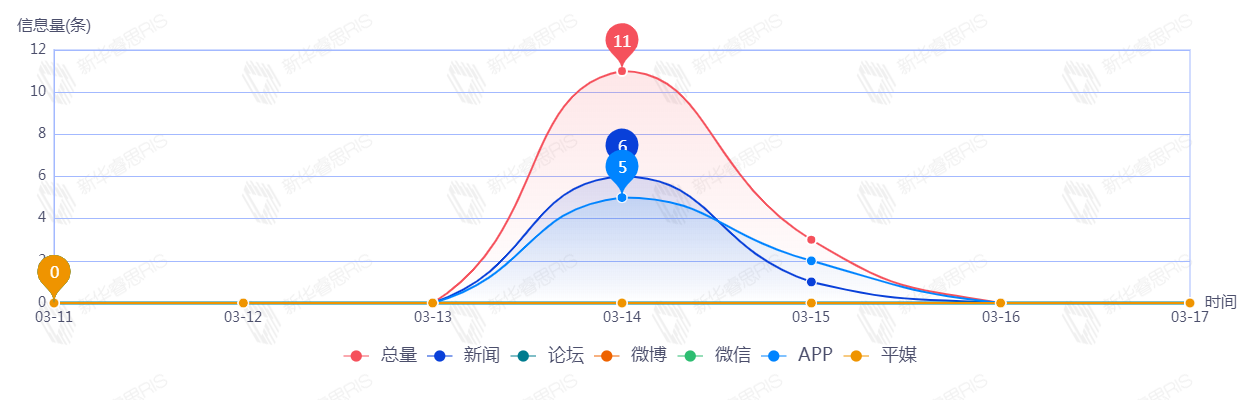 截至目前,该文章在互联网上传播总量共14篇。其中,3月14日是传播的高峰期,共传播11篇文章。各信源的信息发布情况中,其中新闻信息占比最大,其次是APP,占比分别为50.00%、50.00%。(数据来源:新华睿思·数媒智慧分析平台)