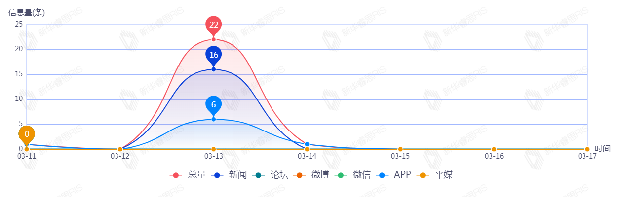 截至目前,该文章在互联网上传播总量共24篇。其中,3月13日是传播的高峰期,共传播22篇文章。各信源的信息发布情况中,其中新闻信息占比最大,其次是APP,占比分别为66.67%、33.33%。(数据来源:新华睿思·数媒智慧分析平台)