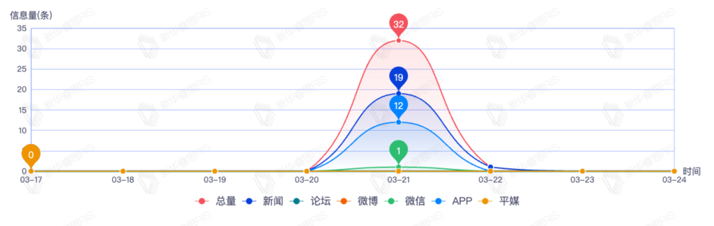 截至目前,该文章在互联网上传播总量33篇。其中3月21日是传播的高峰期,共传播32篇文章。各信源的信息发布情况中,新闻信息占比最大,其次是APP和微信,占比分别为56.67%、40.00%、3.33%。(数据来源:新华睿思数据云图分析平台)