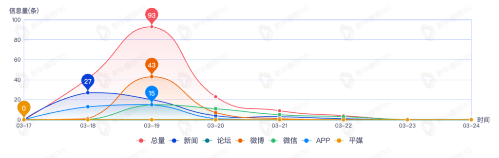 截至目前,该文章在互联网上传播总量170篇。其中3月19日是传播的高峰期,共传播93篇文章。各信源的信息发布情况中,微博信息占比最大,其次是新闻和微信,占比分别为32.50%、28.13%、21.25%。(数据来源:新华睿思数据云图分析平台)