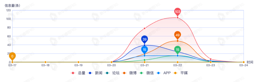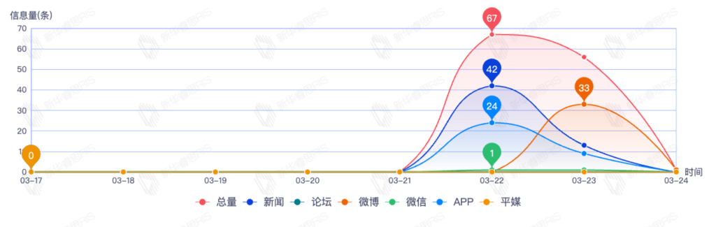 截至目前,该文章在互联网上传播总量124篇。其中3月22日是传播的高峰期,共传播67篇文章。各信源的信息发布情况中,新闻信息占比最大,其次是微博和APP,占比分别为41.53%、28.81%、27.97%。(数据来源:新华睿思数据云图分析平台)