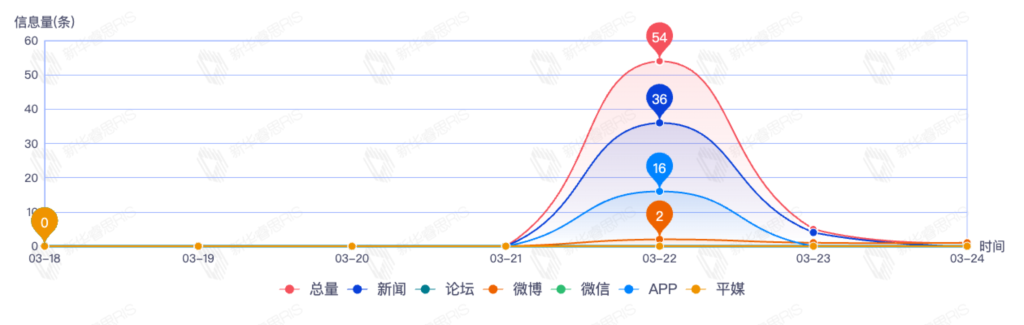 截至目前,该文章在互联网上传播总量60篇。其中3月22日是传播的高峰期,共传播54篇文章。各信源的信息发布情况中,新闻信息占比最大,其次是APP和微博,占比分别为65.52%、27.59%、6.90%。(数据来源:新华睿思数据云图分析平台)