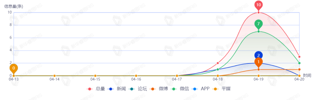 截至目前,该文章在互联网上传播总量15篇。其中4月19日是传播的高峰期,共传播10篇文章。各信源的信息发布情况中,微信信息占比最大,其次是新闻和微博,占比分别为66.67%、20.00%、13.33%。(数据来源:新华睿思数据云图分析平台)