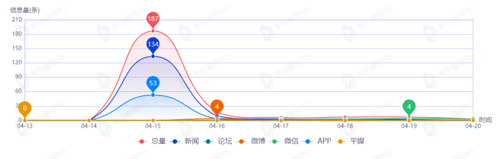 截至目前,该文章在互联网上传播总量227篇。其中4月15日是传播的高峰期,共传播187篇文章。各信源的信息发布情况中,新闻信息占比最大,其次是APP和微信,占比分别为66.52%、25.55%、5.73%。(数据来源:新华睿思数据云图分析平台)