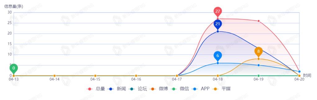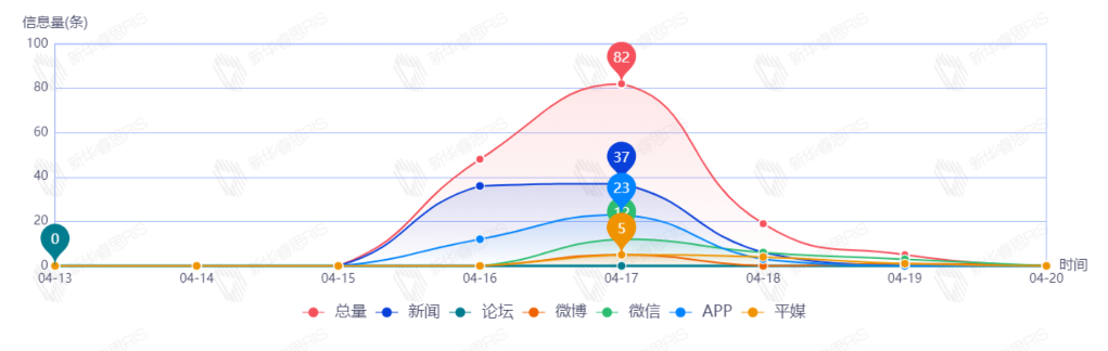 截至目前,该文章在互联网上传播总量154篇。其中4月17日是传播的高峰期,共传播82篇文章。各信源的信息发布情况中,新闻信息占比最大,其次是APP和微信,占比分别为51.30%、24.68%、13.64%。(数据来源:新华睿思数据云图分析平台)