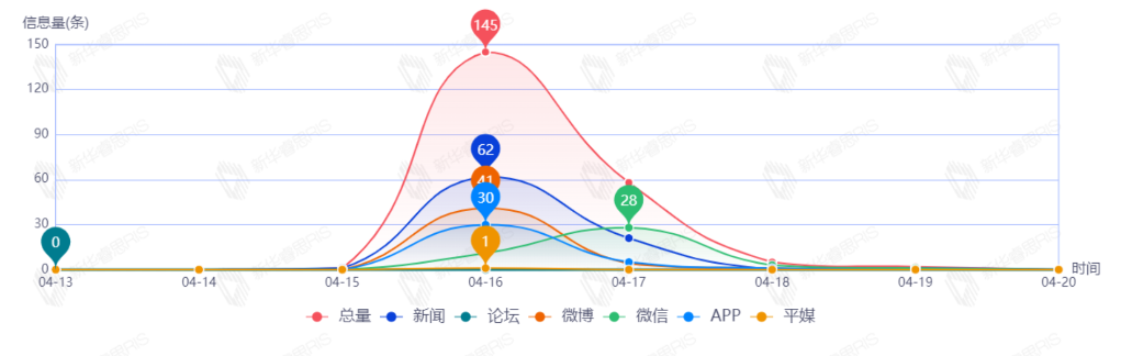 截至目前,该文章在互联网上传播总量211篇。其中4月16日是传播的高峰期,共传播145篇文章。各信源的信息发布情况中,新闻信息占比最大,其次是微博和微信,占比分别为40.28%、21.80%、20.38%。(数据来源:新华睿思数据云图分析平台)