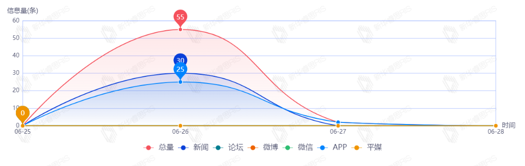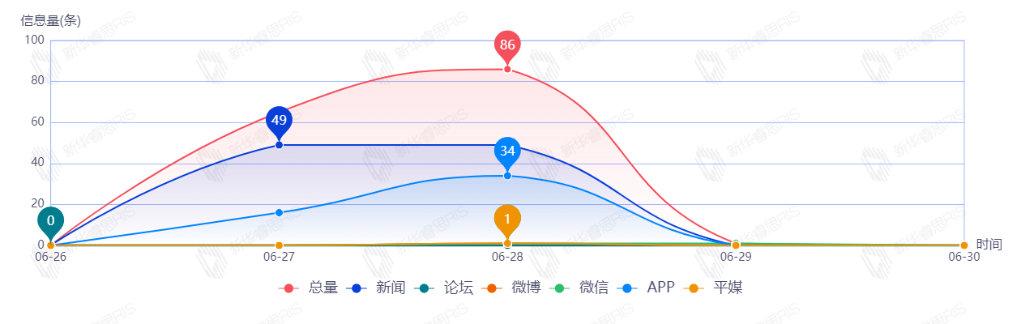 截至目前,该文章在互联网上传播总量共152篇。其中,6月28日是传播的高峰期,共传播86篇文章。各信源的信息发布情况中,其中新闻信息占比最大,其次是APP,占比分别为64.47%和32.89%。(数据来源:新华睿思·数媒智慧分析平台)