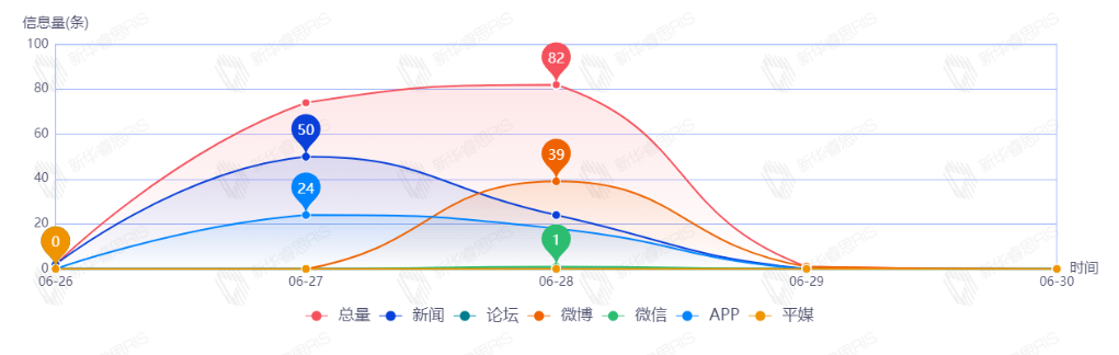 截至目前,该文章在互联网上传播总量共159篇。其中,6月28日是传播的高峰期,共传播82篇文章。各信源的信息发布情况中,其中新闻信息占比最大,其次是APP和微博,占比分别为49.03%、27.10%、23.23%。(数据来源:新华睿思·数媒智慧分析平台)