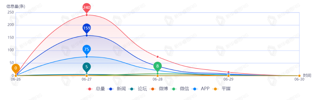 截至目前,该文章在互联网上传播总量共329篇。其中,6月27日是传播的高峰期,共传播240篇文章。各信源的信息发布情况中,其中新闻信息占比最大,其次是APP,占比分别为62.20%和30.49%。(数据来源:新华睿思·数媒智慧分析平台)