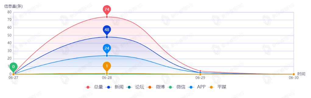 截至目前,该文章在互联网上传播总量共78篇。其中,6月28日是传播的高峰期,共传播74篇文章。各信源的信息发布情况中,其中新闻信息占比最大,其次是APP,占比分别为64.86%、24.43%。(数据来源:新华睿思·数媒智慧分析平台)