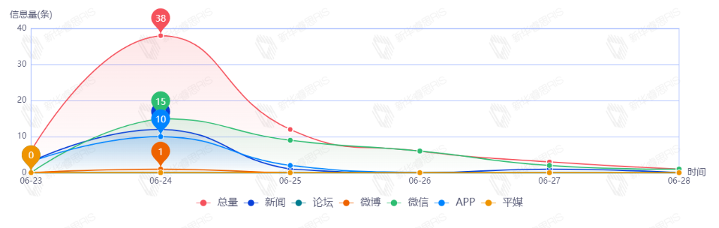 截至目前,该文章在互联网上传播总量共66篇。其中,6月24日是传播的高峰期,共传播38篇文章。各信源的信息发布情况中,其中微信占比最大,其次是新闻和APP,占比分别为50.00%、25.76%、22.73%。(数据来源:新华睿思·数媒智慧分析平台)