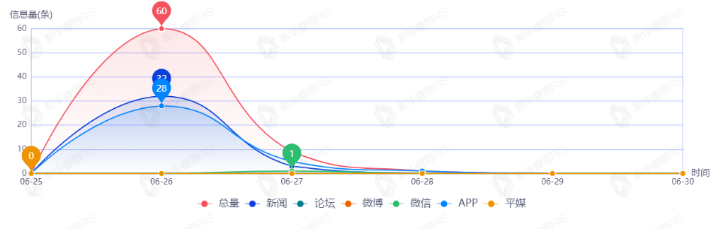 截至目前,该文章在互联网上传播总量共70篇。其中,6月26日是传播的高峰期,共传播60篇文章。各信源的信息发布情况中,其中新闻信息占比最大,其次是APP,占比分别为50.00%、48.57%。(数据来源:新华睿思·数媒智慧分析平台)