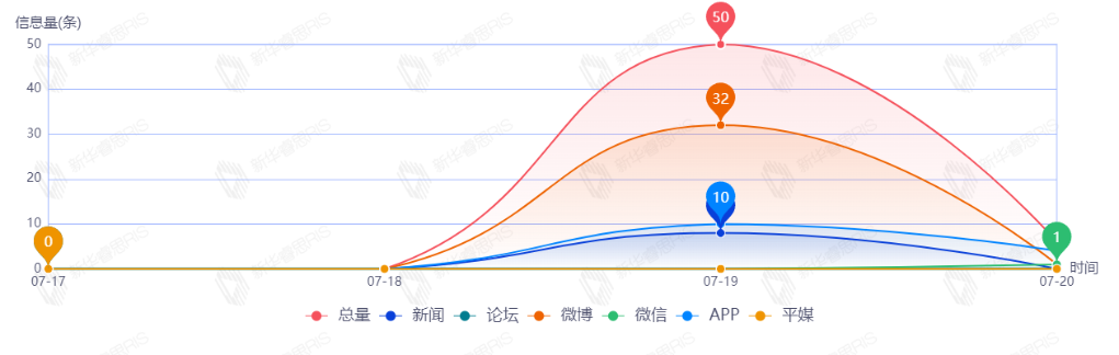 截至目前,该文章在互联网上传播总量56篇。其中7月19日是传播的高峰期,共传播50篇文章。各信源的信息发布情况中,微博占比最大,其次是APP和新闻,占比分别为58.93%、25.00%、14.29%。(数据来源:新华睿思数据云图分析平台)