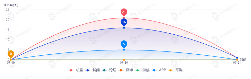 截至目前,该文章在互联网上传播总量22篇。其中7月20日是传播的高峰期,共传播21篇文章。各信源的信息发布情况中,新闻信息占比最大,其次是APP,占比分别为77.27%和22.73%。(数据来源:新华睿思数据云图分析平台)