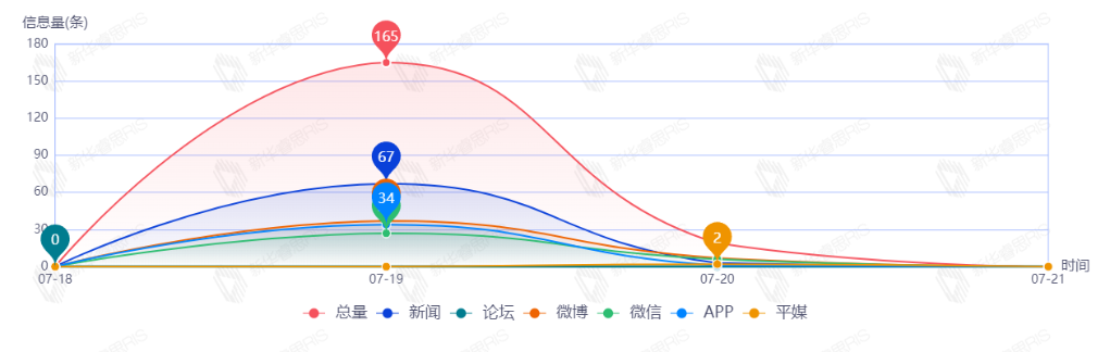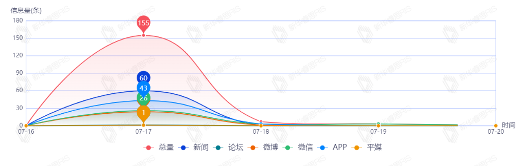 截至目前,该文章在互联网上传播总量166篇。其中7月17日是传播的高峰期,共传播155篇文章。各信源的信息发布情况中,新闻信息占比最大,其次是APP和微信,占比分别为36.14%、27.71%、19.88%。(数据来源:新华睿思数据云图分析平台)