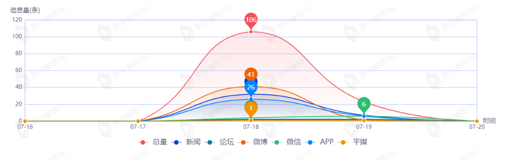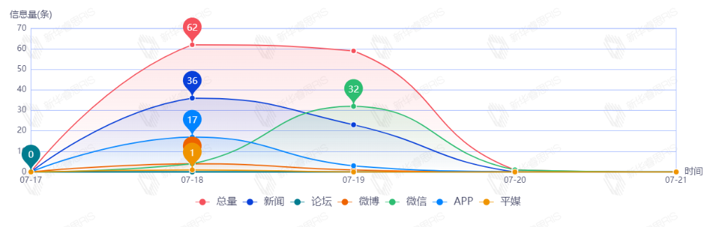 截至目前,该文章在互联网上传播总量122篇。其中7月18日是传播的高峰期,共传播62篇文章。各信源的信息发布情况中,新闻信息占比最大,其次是微信和APP,占比分别为48.36%、30.33%、16.39%。(数据来源:新华睿思数据云图分析平台)