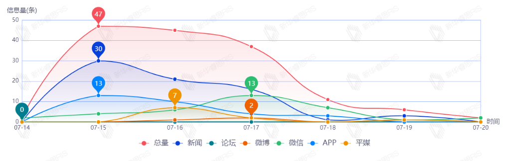 截至目前,该文章在互联网上传播总量150篇。其中7月15日是传播的高峰期,共传播47篇文章。各信源的信息发布情况中,新闻信息占比最大,其次是微信和APP,占比分别为47.33%、23.33%、20.00%。(数据来源:新华睿思数据云图分析平台)