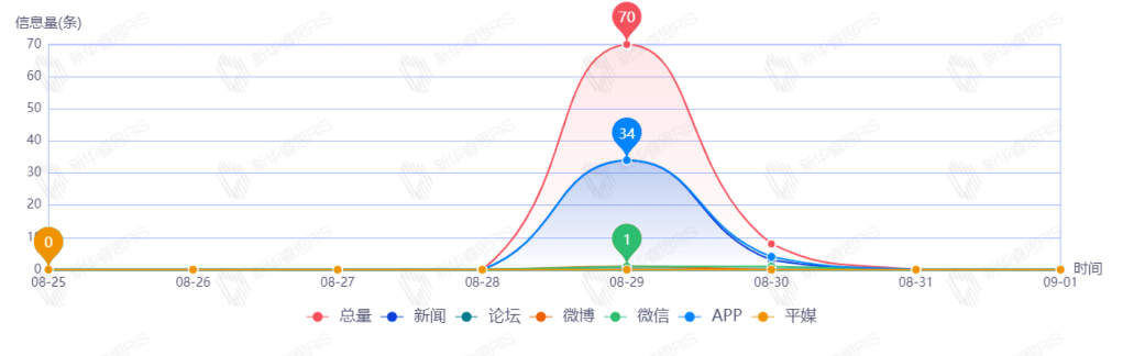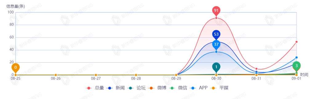 截至目前,该文章在互联网上传播总量153篇。其中8月30日是传播的高峰期,共传播91篇文章。各信源的信息发布情况中,新闻信息占比最大,其次是APP和论坛,占比分别为50.00%、44.16%、1.95%。(数据来源:新华睿思数据云图分析平台)