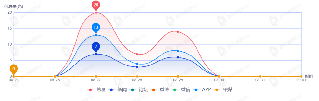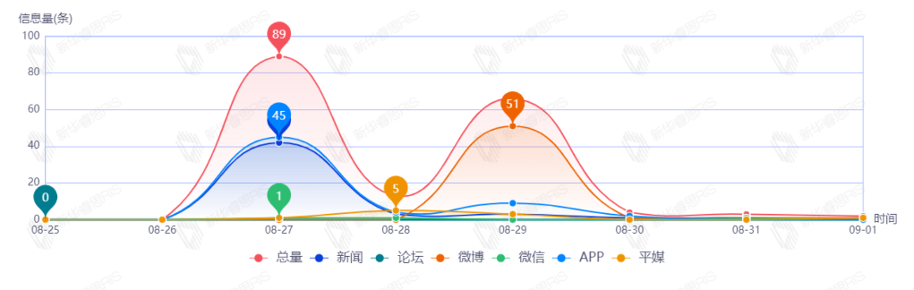 截至目前,该文章在互联网上传播总量177篇。其中8月27日是传播的高峰期,共传播89篇文章。各信源的信息发布情况中,APP信息占比最大,其次是微博和新闻,占比分别为33.90%、30.51%、28.25%。(数据来源:新华睿思数据云图分析平台)