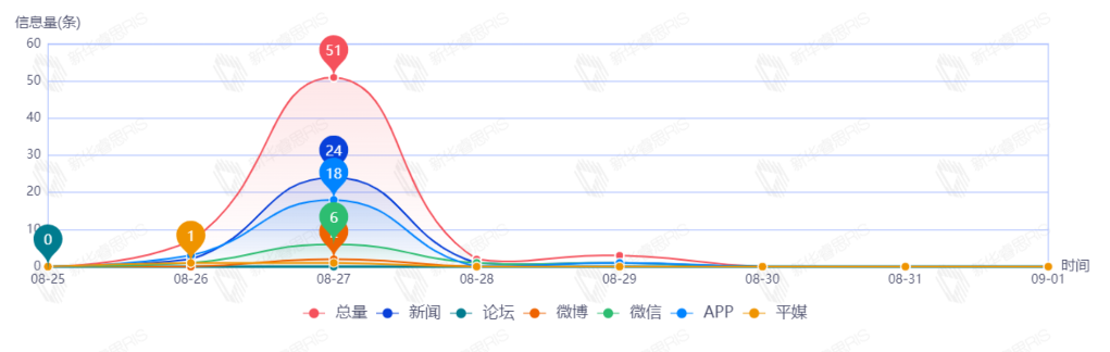 截至目前,该文章在互联网上传播总量69篇。其中8月27日是传播的高峰期,共传播51篇文章。各信源的信息发布情况中,新闻信息占比最大,其次是APP和微信,占比分别为44.44%、34.92%、14.29%。(数据来源:新华睿思数据云图分析平台)