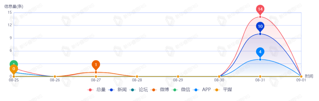 截至目前,该文章在互联网上传播总量17篇。其中8月31日是传播的高峰期,共传播14篇文章。各信源的信息发布情况中,新闻信息占比最大,其次是APP和微信,占比分别为58.82%、29.41%、5.88%。(数据来源:新华睿思数据云图分析平台)