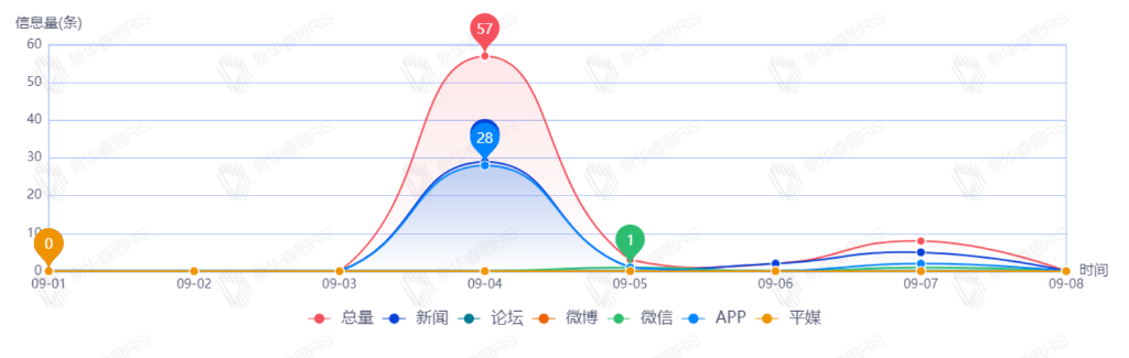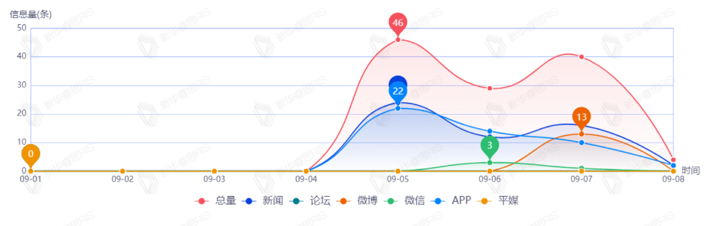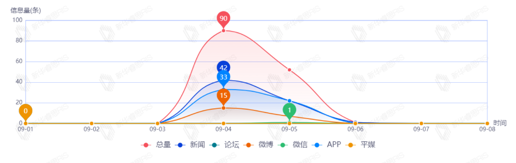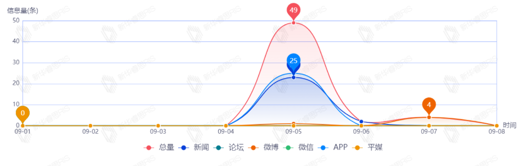 截至目前,该文章在互联网上传播总量55篇。其中9月5日是传播的高峰期,共传播49篇文章。各信源的信息发布情况中,新闻信息占比最大,其次是APP和微博,占比分别为45.45%、45.45%、9.09%。(数据来源:新华睿思数据云图分析平台)