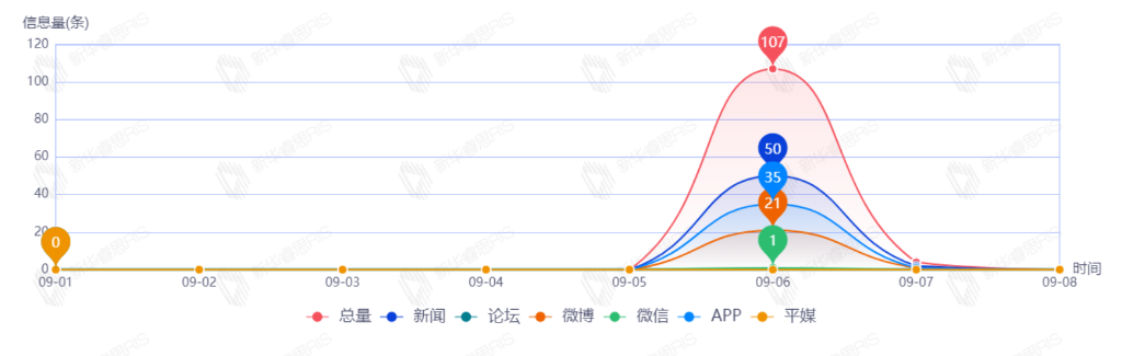 截至目前,该文章在互联网上传播总量111篇。其中9月6日是传播的高峰期,共传播107篇文章。各信源的信息发布情况中,新闻信息占比最大,其次是APP和微博,占比分别为46.85%、32.43%、19.82%。(数据来源:新华睿思数据云图分析平台)