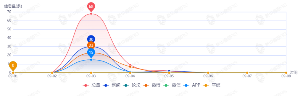 截至目前,该文章在互联网上传播总量79篇。其中9月3日是传播的高峰期,共传播68篇文章。各信源的信息发布情况中,新闻信息占比最大,其次是微博和APP,占比分别为41.77%、37.97%、20.25%。(数据来源:新华睿思数据云图分析平台)